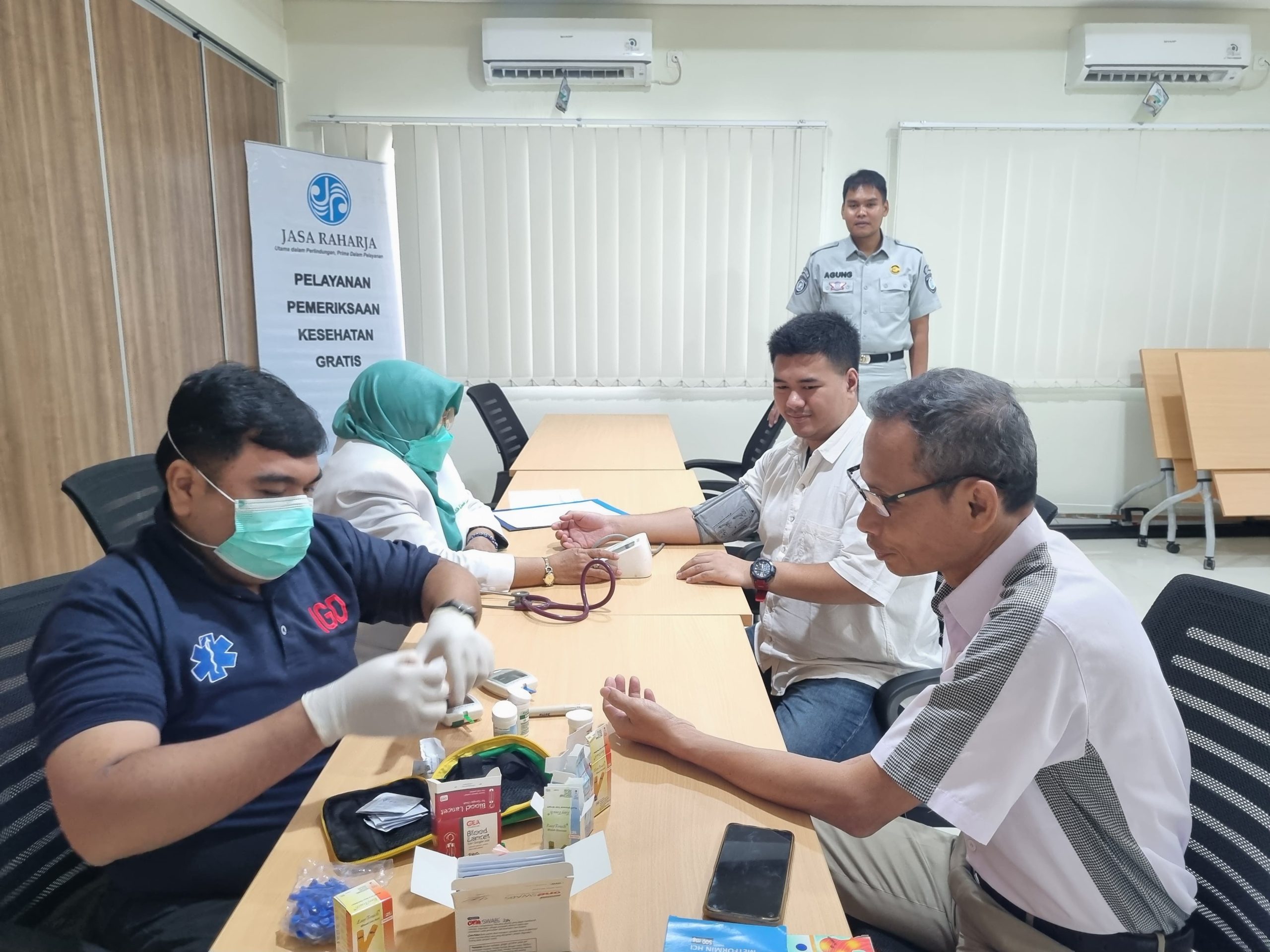 Jasa Raharja Perwakilan Tangerang Cabang Banten mengadakan pelayanan pemeriksaan kesehatan dan pengobatan gratis di PO Gading Transwisata Kota Tangerang Selatan, Kamis (07/03/2024).